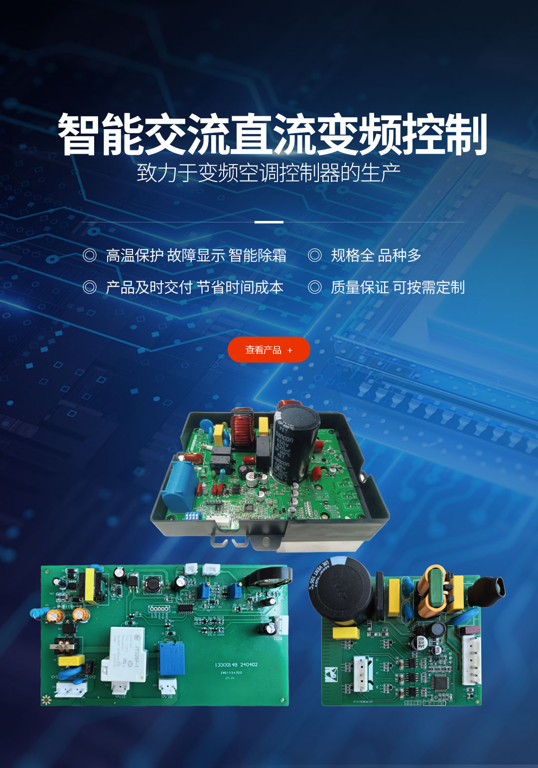 公司目前有多種專利,并具備生產及工藝技術。年產家電控制器一百萬套,產品廣泛用于空調、中央空調、電熱水器、冰箱、洗衣機、水暖毯、健身器材智能控制器等領域。目前是國內變頻通用控制系統品牌。
